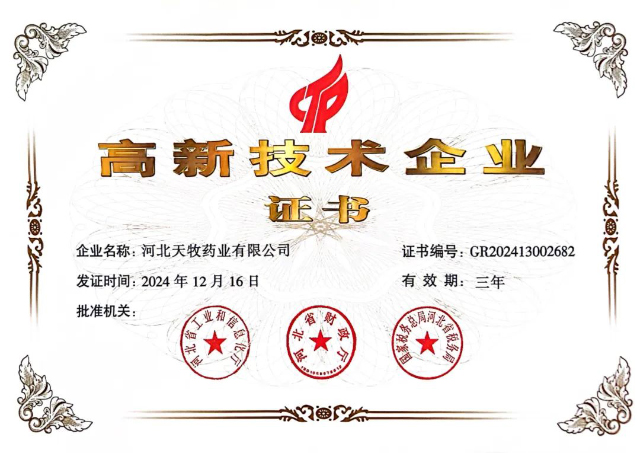 近日,根據(jù)《高新技術企業(yè)認定管理辦法》(國科發(fā)火〔2016〕32號)和《高新技術企業(yè)認定管理工作指引》(國科發(fā)火〔2016〕195號)有關規(guī)定,河北天牧藥業(yè)有限公司成功通過相關部門的評審,正式認定為“高新技術企業(yè)”。